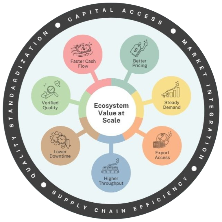 Recyclore operates as a coordinated platform integrating supply, recovery, processing, financing, and export into a unified material flow system—linking regional networks to global markets through structured execution and infrastructure.